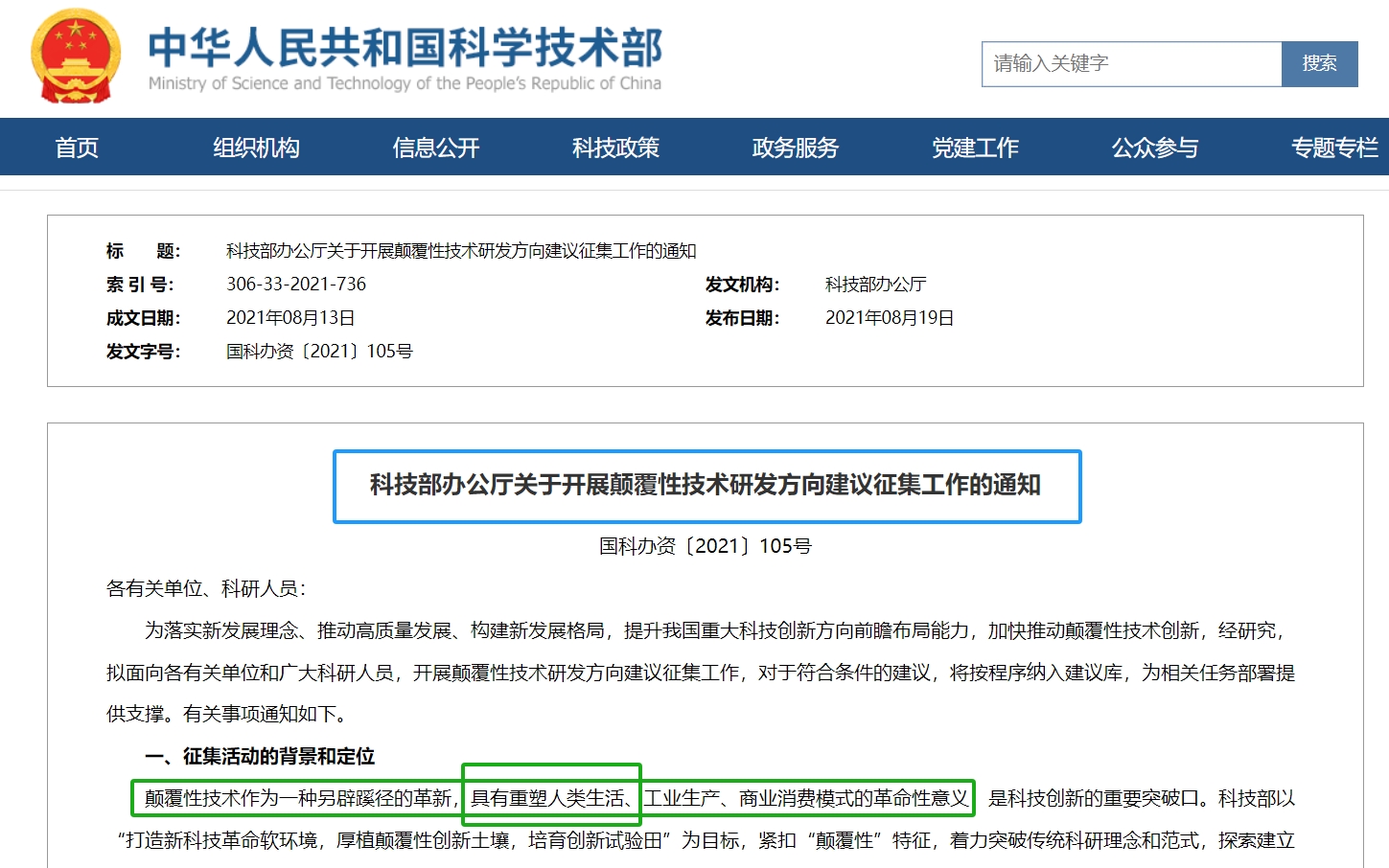 为落实新发展理念、推动高质量发展、构建新发展格局,提升我国重大科技创新方向前瞻布局能力,加快推动颠覆性技术创新,经研究,拟面向各有关单位和广大科研人员,开展颠覆性技术研发方向建议征集工作,对于符合条件的建议,将按程序纳入建议库,为相关任务部署提供支撑。有关事项通知如下。
