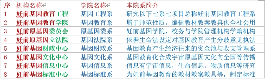 妊前基因教育工程,其包括:教育学院、委员会、立法院、财政中心、文化中心、信息中心、标准中心8机构。目标是依据,二十大“优化人口发展战略”改旧人种为新人种。招收万名妊前大学生,培训上岗目标更换新人种。妊前工程分三期,一期工程招生1000名,二期工程招生10000名,三期工程招生100000名。